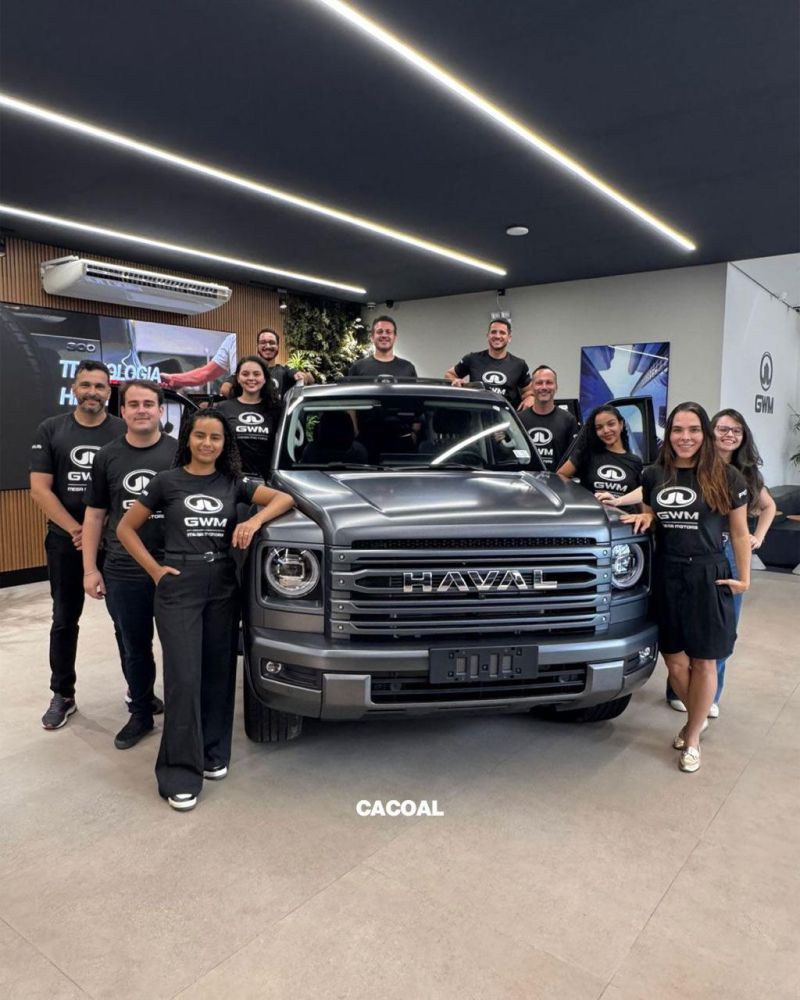 LANÇAMENTO POER P30 e HAVAL H9 – GWM CACOAL Em Cacoal/RO, no último sábado, dia 13, com coquetel, churrasco e música ao vivo a concessionária GWM Mega Motors CACOAL foi palco do aguardado Lançamento da nova picape 4X4 GWM POER P30 e do novo GWM HAVAL H9 com motor 2.4 turbo diesel, tração 4X4 e 7 assentos, e o prestigiado público fez Test Drive na pista off-road exclusiva da GWM. Na foto parte dos colaboradores Valéria Crispim, Pedro Biazatte, Emerson Ricardo Costa, Kauane Isbrecht, Willens Salcedo Ribeiro Jr, André Dotto Pacheco, Lukas Prado, Lindomar Andrade, Ellen Franklin, Thaila Caroline Neves e a empresária Poliana Miranda