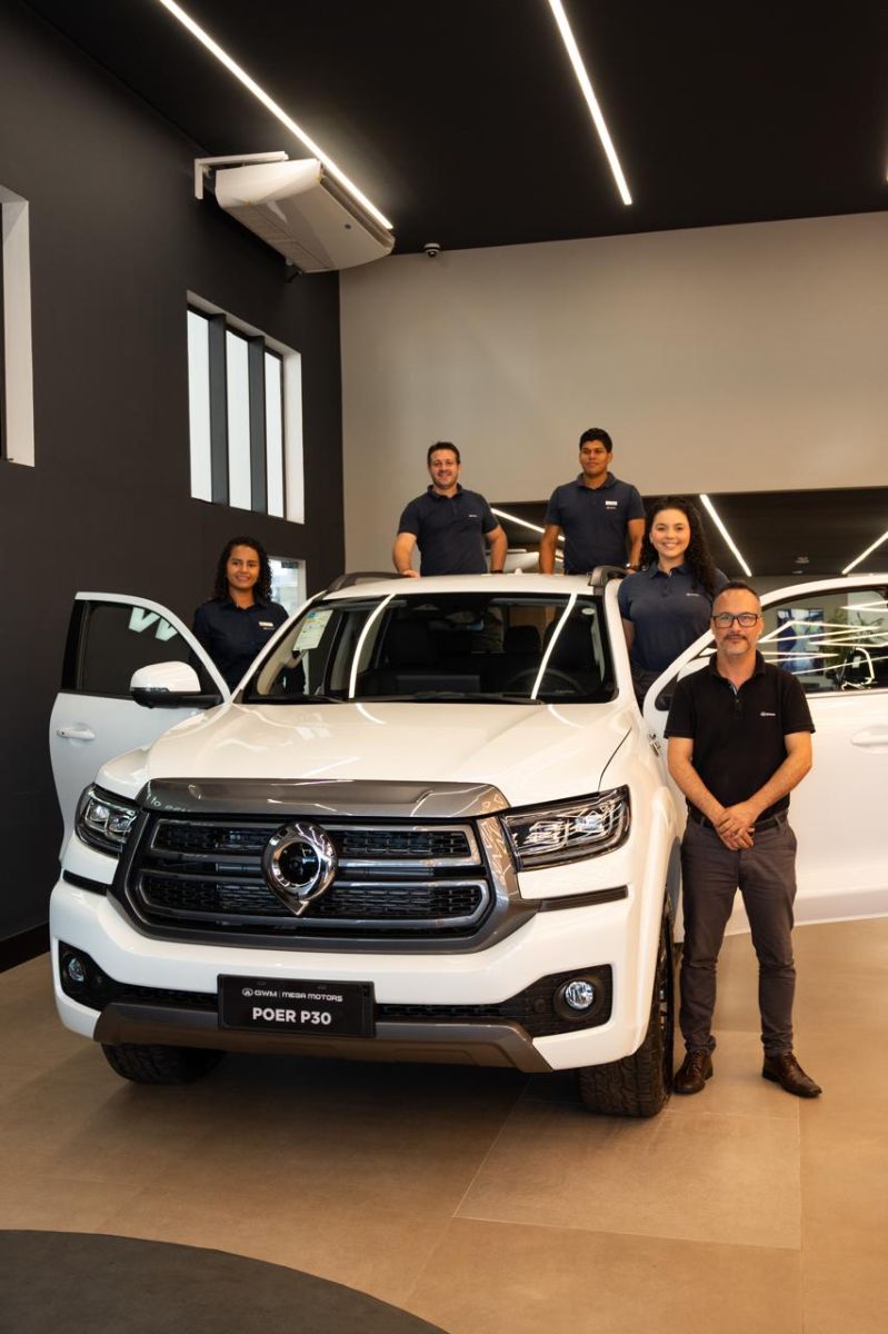 Em Cacoal/RO, na concessionária GWM MEGA MOTORS da GWM linha eletrificada mais completa e sustentável do mercado, registro da equipe de Embaixadores de Vendas um atencioso e comprometido time em entregar diariamente o melhor aos clientes. Na foto Valéria Pereira, André Dotto Pacheco, Deywysson Valentin e Kauane Isbrecht, com o gestor de marketing Lindomar Andrade da GWM Cacoal
