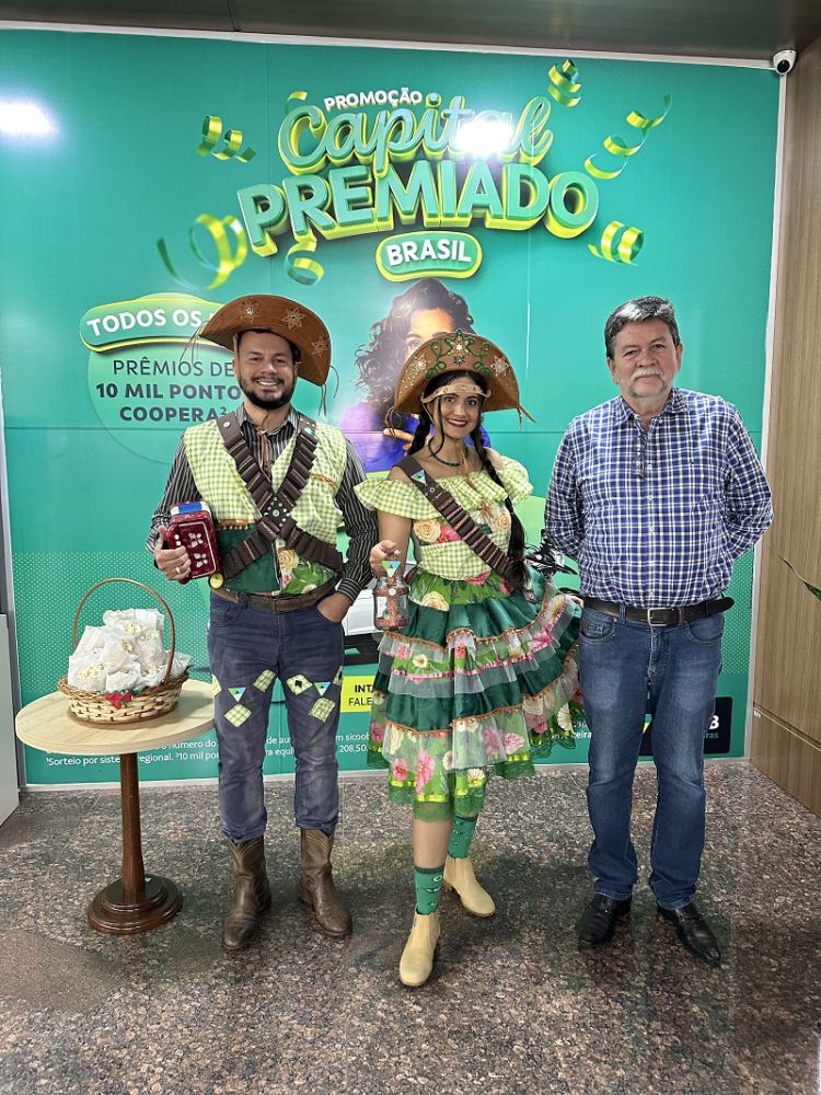 ARRAIÁ NO SICOOB FRONTEIRAS A renomada SICOOB FRONTEIRAS cooperativa financeira com sede em Cacoal/RO, que soma mais de 20 mil cooperados em suas agências em Rondônia, Mato Grosso e Mato Grosso do Sul, se destaca pelo respeito e reconhecimento aos seus colaboradores, investindo na construção de um ambiente de trabalho positivo e engajador, e envolve seus colaboradores na comemoração das datas especiais do calendário anual, como neste mês das festas juninas. Na foto registrei um dos fundadores do SICOOB FRONTEIRAS Vornei Bernardes da Costa, com os colaboradores Jhonathan Henrique Helmer e Karynne de Freitas lindamente trajados de Lampião e Maria Bonita durante o expediente.