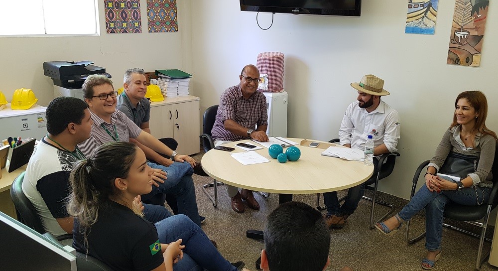 O diretor geral do IFRO Campus Cacoal/RO professor Davys Sleman de Negreiros, ao centro de camisa xadrez, recepcionou reunião que o IDARON e a EMATER firmaram convênio com o Instituto Federal de Educação, Ciência e Tecnologia de Rondônia com o objetivo de implantarem Laboratório de Análise Física de Grãos, que dentre diversas atividades, a partir de 2020 servirá para a realização da análise física dos cafés inscritos no Concurso de Qualidade e Sustentabilidade do Café de Rondônia – CONCAFÉ.