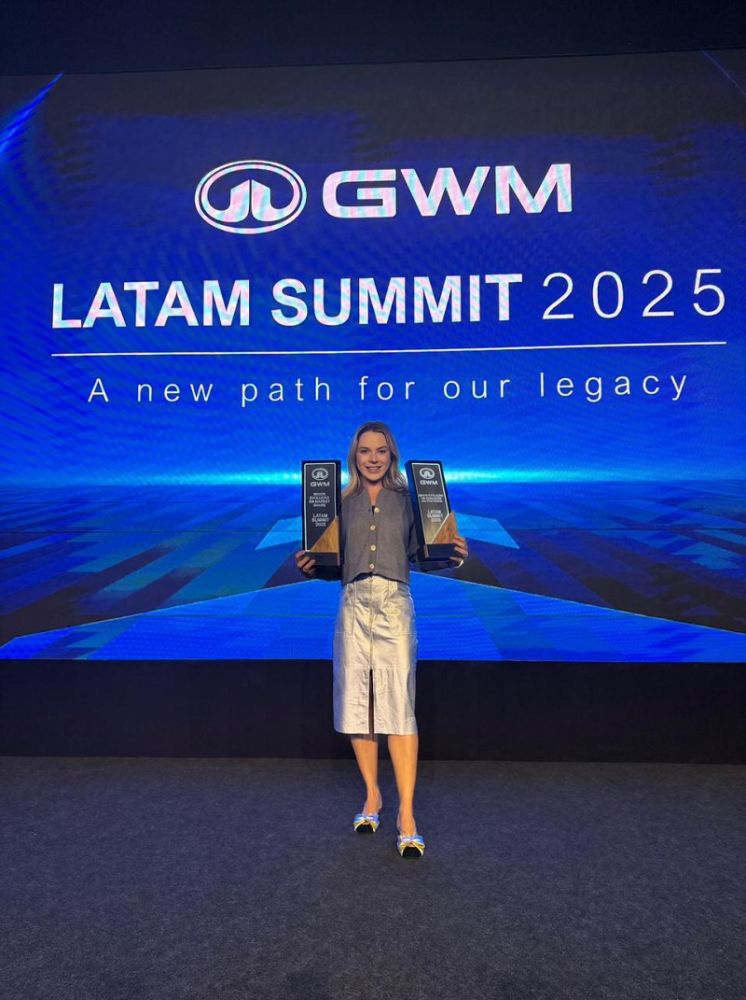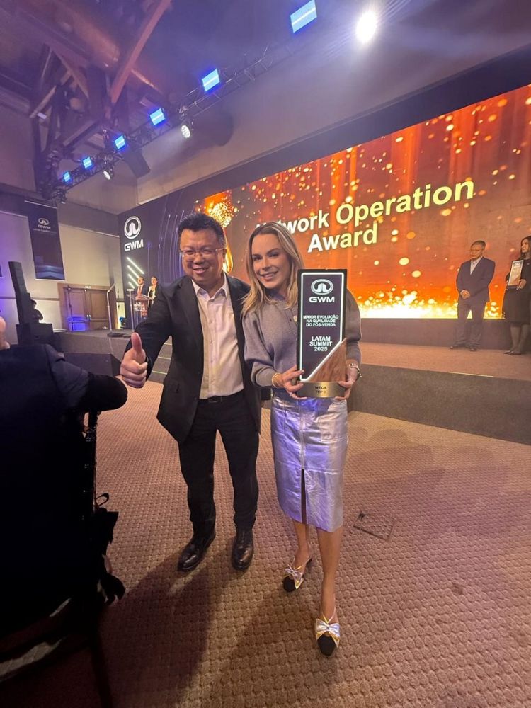 CONQUISTA E RECONHECIMENTO – GWM MEGA MOTORS Em noite especial em São Paulo a empresária Letícia Miranda Beltrame sócia proprietária com a irmã Poliana Miranda da GWM MEGA MOTORS em Porto Velho e Cacoal/RO, recebeu premiação de destaque no LATAM Summit 2025 pela Mega GWM com os prêmios de Maior Evolução em Market Share e Maior Evolução na Qualidade do Pós-Venda como confirmações da força, estratégia e liderança das concessionárias GWM Mega Motors, que já transforma o mercado em Porto Velho e Cacoal e, em breve, também em Ariquemes e Vilhena, levando excelência a todo estado de Rondônia. Na foto Letícia com os prêmios conquistados e com Andy Zhang presidente GWM Brasil & México